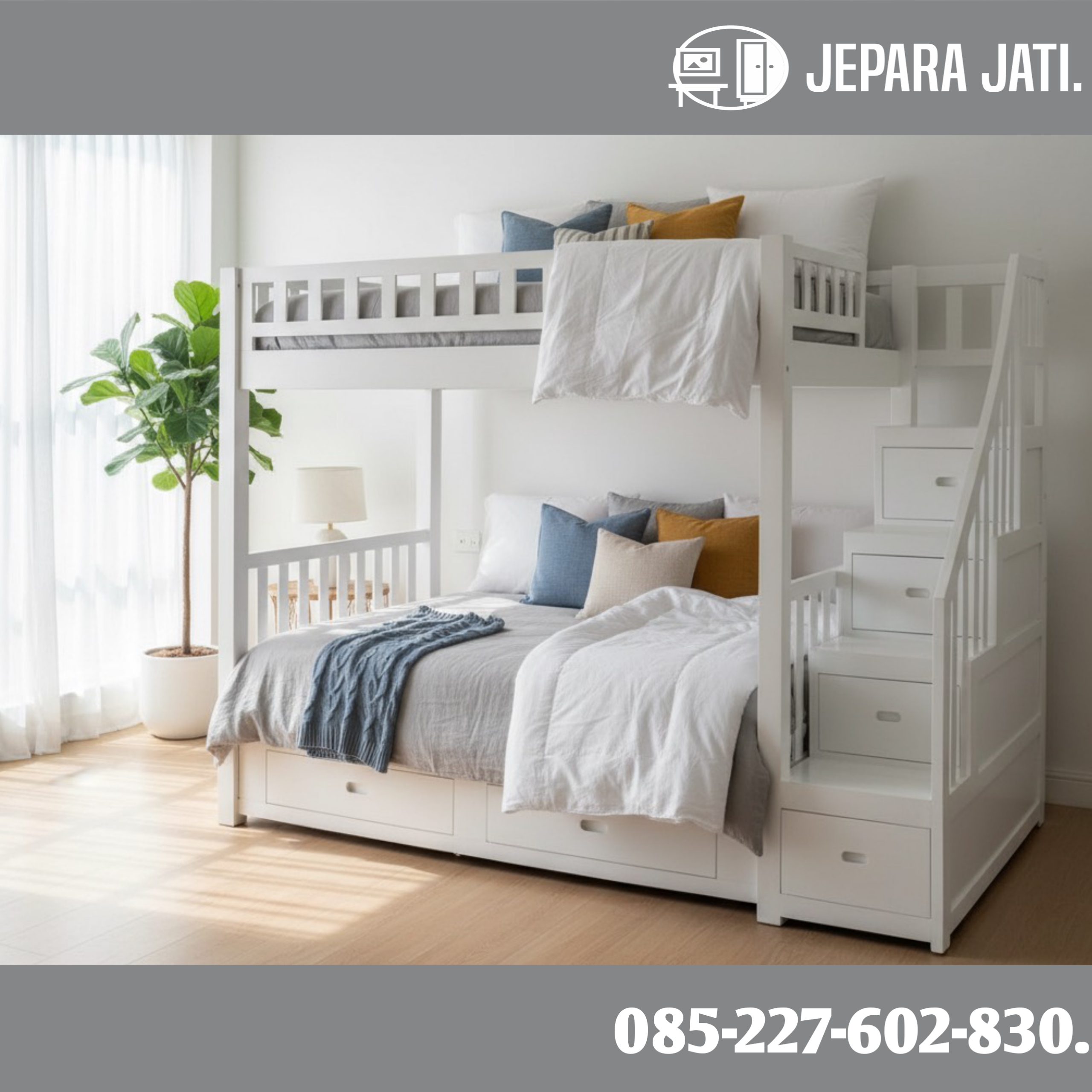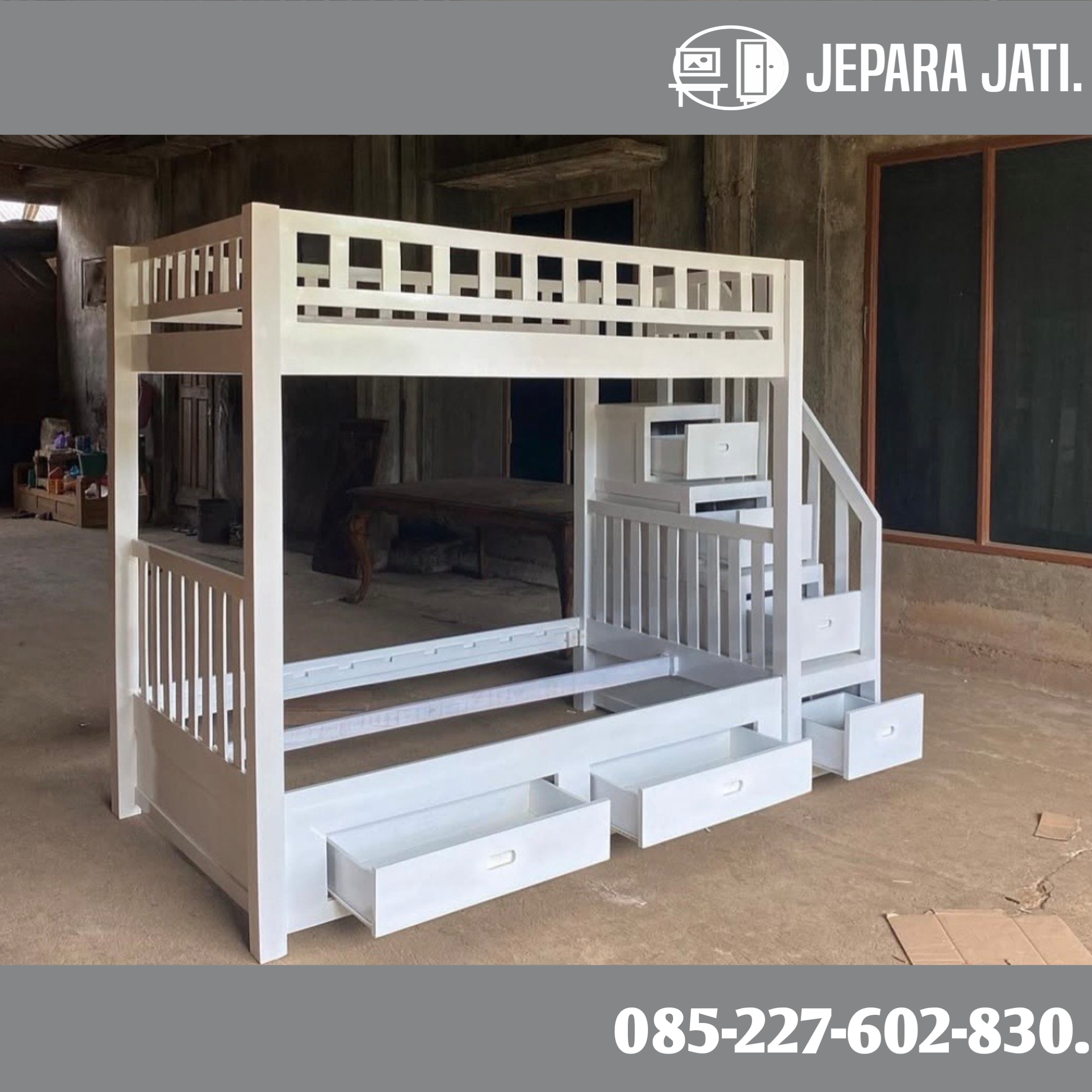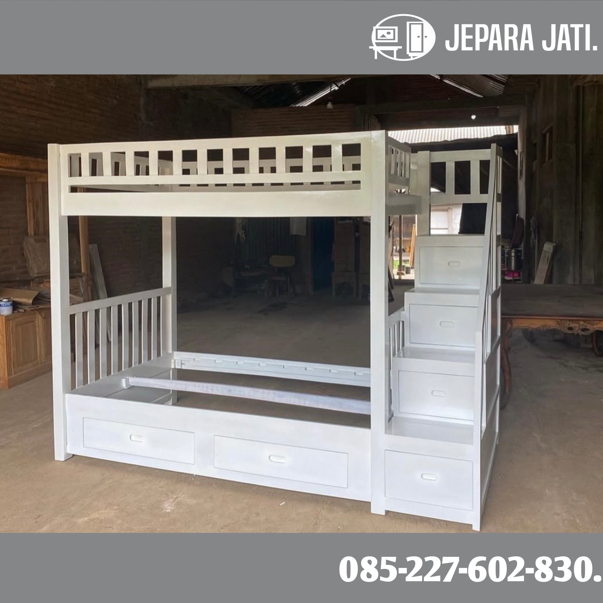 Salah satu produk Jual tempat Tidur Tingkat yang bisa kami rekomendasikan untuk anda, dimana produk kami ini secara real pernah diproduksi oleh pengrajin mebel jepara, bisa dilihat dari gambar dibawah ini kami ambil fotonya ditempat produksi kami, secara desain produk Mebel Jepara Jati ini mengusung desain minimalis tingkat dengan 2 tempat tidur atas bawah yang ukuran kasurnya sama yaitu 120 x 200 cm, pada bagian tangga kita fungsikan sebagai laci ditambah 2 laci pada bawah tempat tidur jadi jumlahnya 2 laci besar cocok untuk menaruh pakaian anak anak kita, untuk tarikan laci ini sangat aman tidak mengganggu karena kita bikin coakan ke dalam.